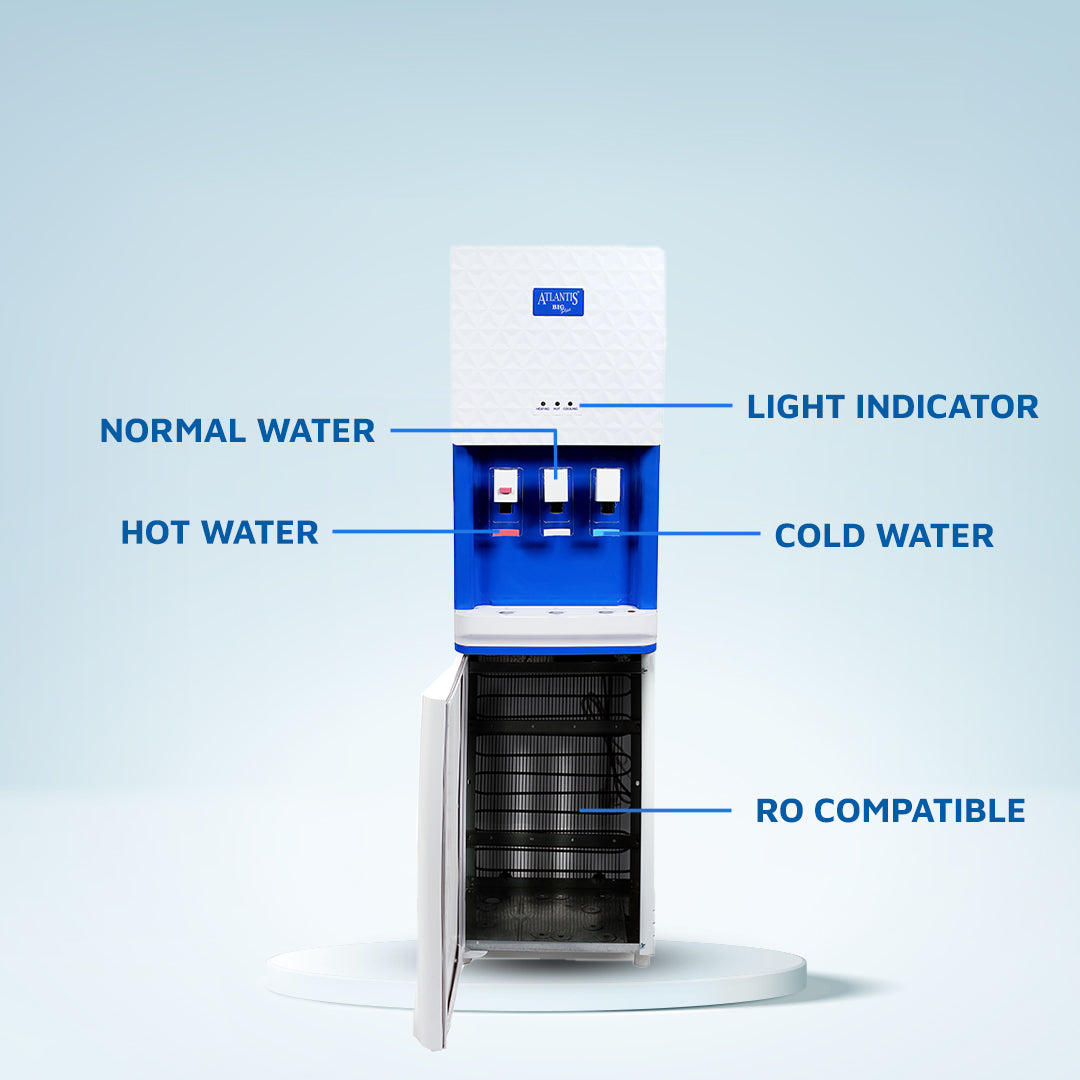 Are you tired of constantly buying bottled water or struggling with a bottle top water dispenser? Say goodbye to these problems, and hello to the RO compatible BIG PLUS water dispenser! Easily enjoy pure and clean water anytime you want, without any hassle. The Atlantis Big Plus Water Dispenser has been designed to provide ultimate convenience. The floor-standing model is an excellent choice for locations where efficiency is an essential consideration.Whether it's any office, a large industrial facility, or any corporate environment, the Atlantis Big Plus Water Dispenser is well-suited to cater to your hydration needs. It offers hot, cold and normal water options, ensuring that everyone can enjoy refreshing drinks.